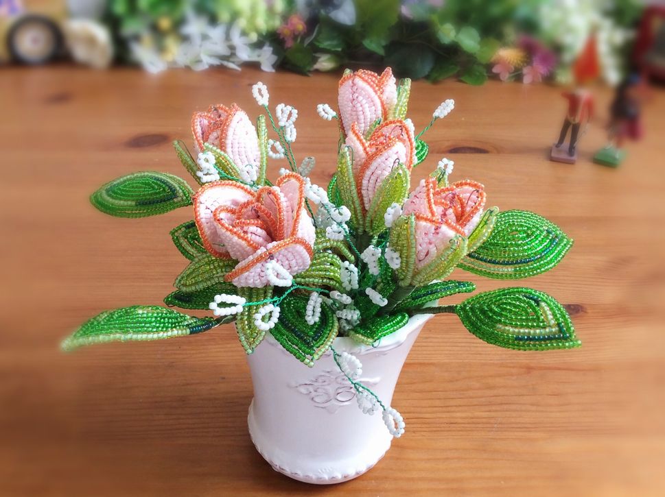 ばらです。赤いバラも綺麗ですが、今回は淡いクリームピンクでのバラになります。グリーンもグラデーションをかけて盛り込んであります。花器は初登場のものでアンティーク調の模様が入っています(擦れている感をだしています)。
